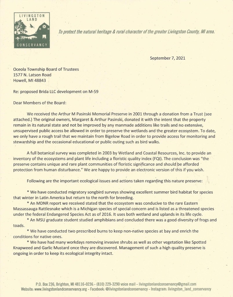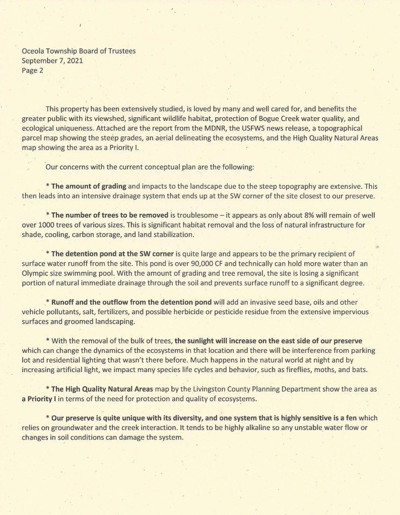 Below is the statement given to Oceola Township Board regarding our concerns on the proposed development to the east of our property on September 7, 2021: