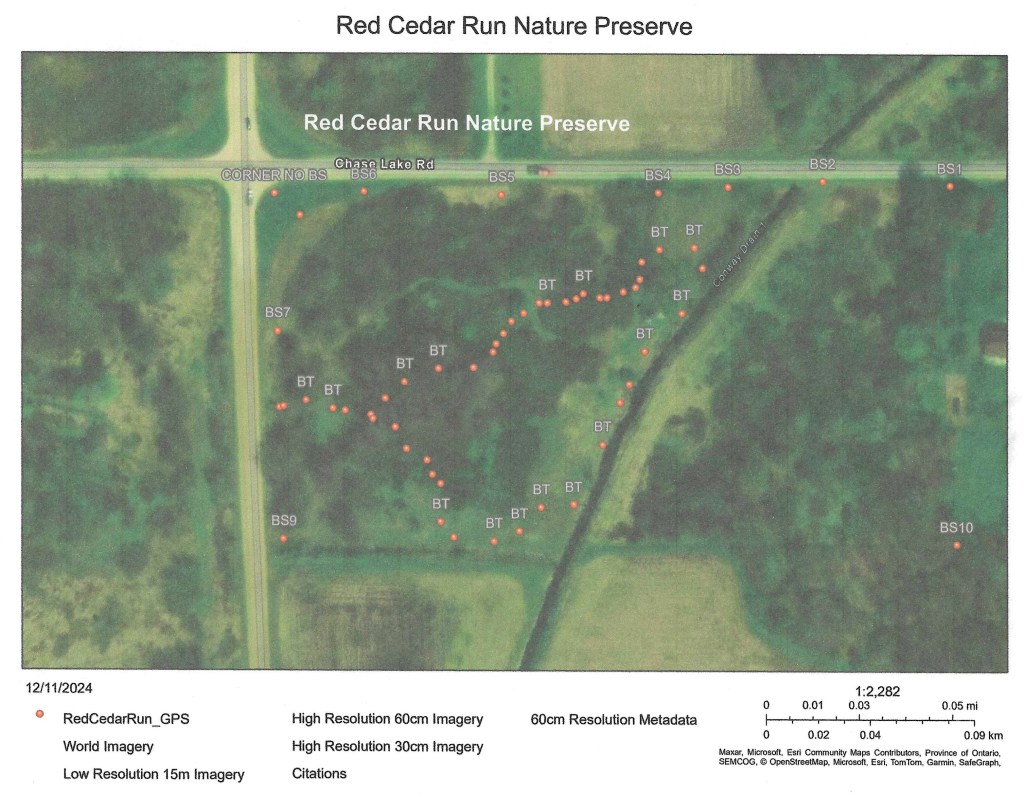 This 12-acre piece was purchased in December 2021 and is located at Nicholson and Chase Lake Roads in Conway Township. This is a bird haven due to the diversity of the native shrub thickets that exist – Grey and Red-osier Dogwood, Elderberry, High Bush Cranberry, Maple leaved Viburnum, Nannyberry, and Prickly Ash, to name a few. A public birding trail was established in 2025 thanks to significant work of BSA Troop 362 out of Howell. To access it, park along Nicholson Road where the trailhead is. (See map below.)